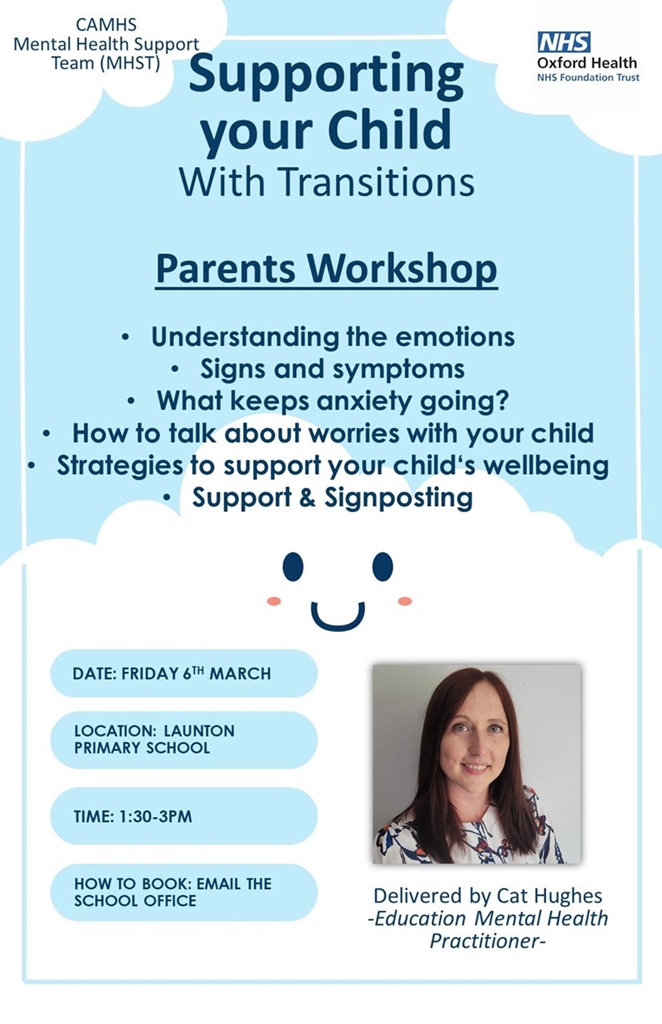 After half term, Cat Hughes and her colleagues from the Schools’ Mental Health Support Team (part of Oxfordshire NHS) will be putting on two workshops, one for our Year 6 pupils on the theme of transition, and one for parents and carers. If you would like to join us on Friday 6th March, for the parents and carers workshop on supporting children, please email the office by midday on Thursday 5th March to book a place. All our parents and carers are welcome, whatever age your child is.