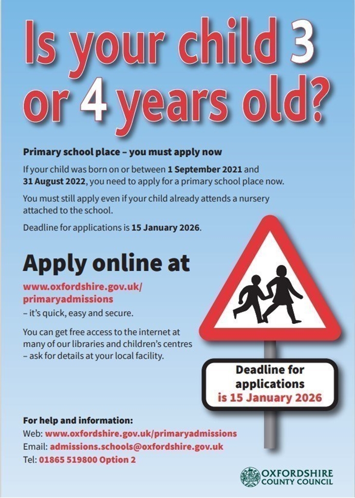 - Thursday 15th January - Deadline for applying for a school place to start September 2026 for Children born between 1 September 2021 and 31 August 2022.